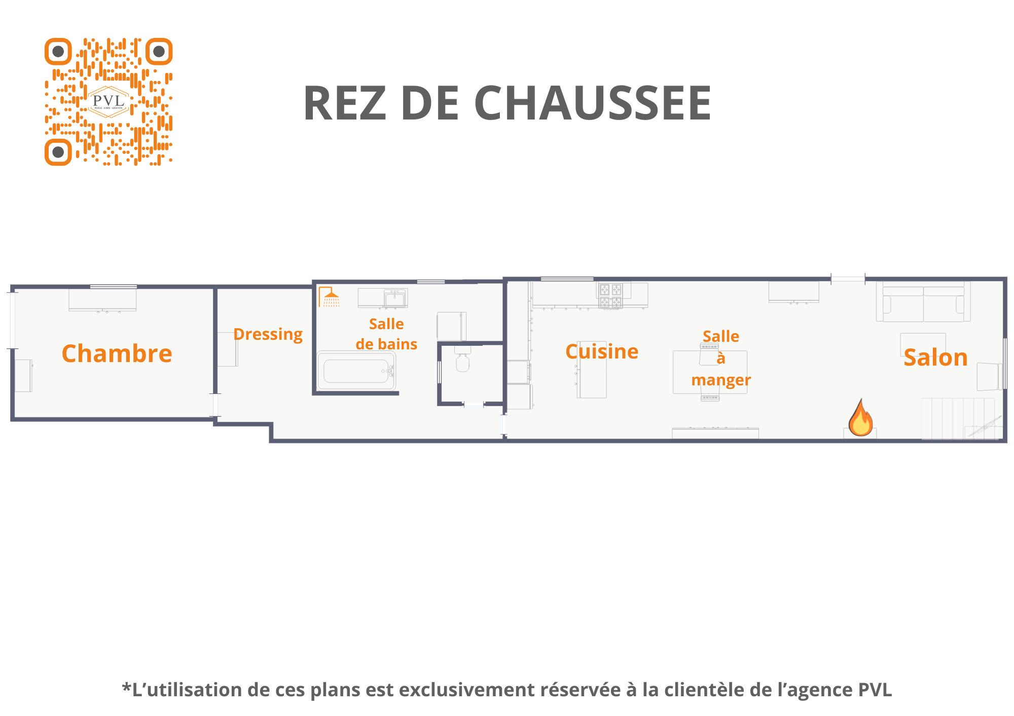 Le rez-de-chaussée comprend également une salle de bain ainsi qu’une grande chambre et un espace dressing.