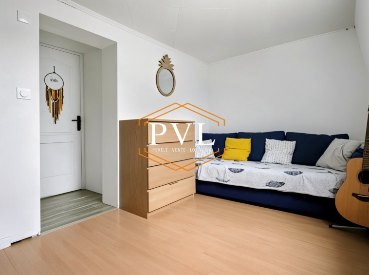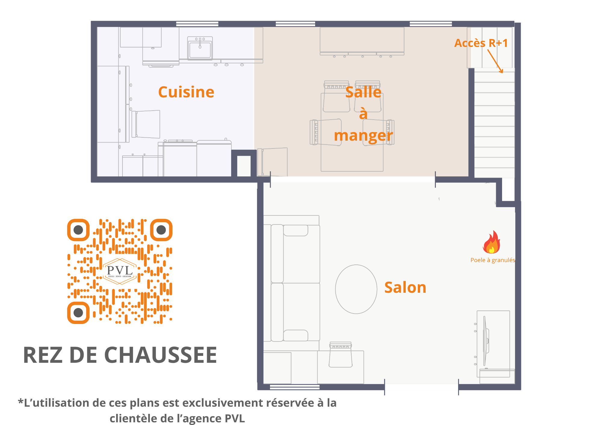 Le rez-de-chaussée se compose d’une pièce de vie ouverte comprenant le salon avec poêle à pellets, salle à manger et cuisine équipée.