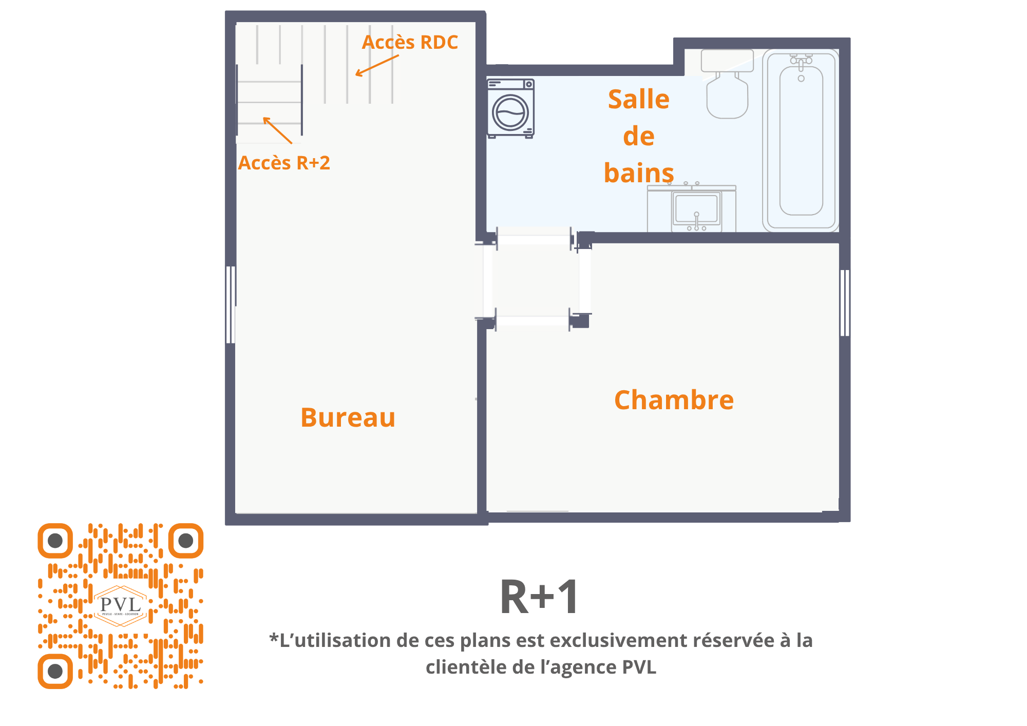 L’étage dessert un bureau, une salle de bains ainsi qu’une chambre.