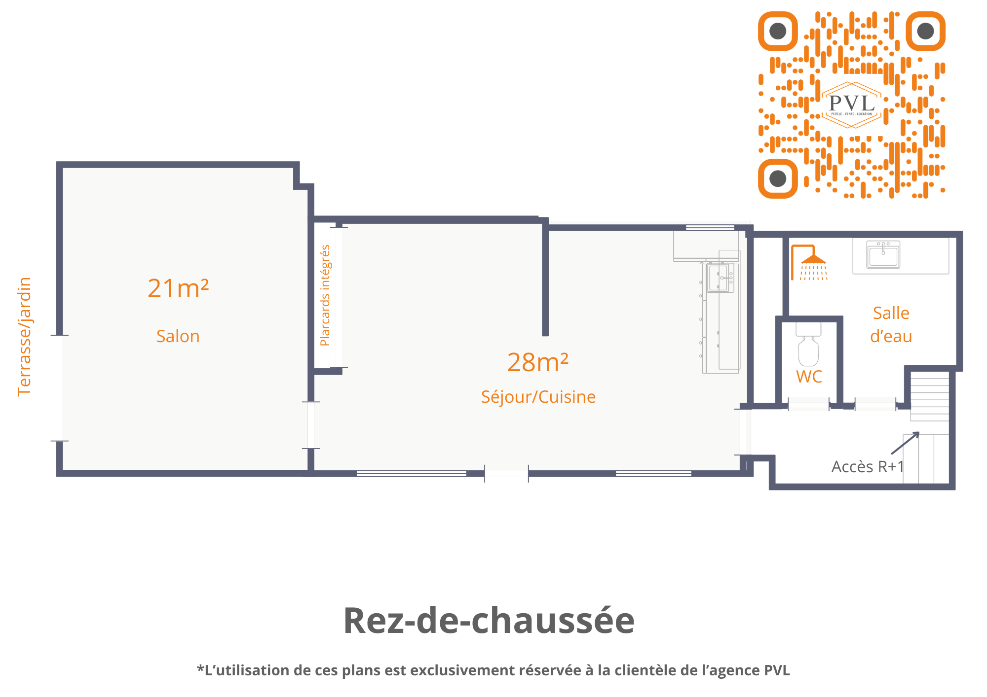 Pièces : 2 chambres (dont une petite), 1 salle de douche en rdc, cuisine, salle à manger et salon donnant sur une terrasse transformable en jardin.