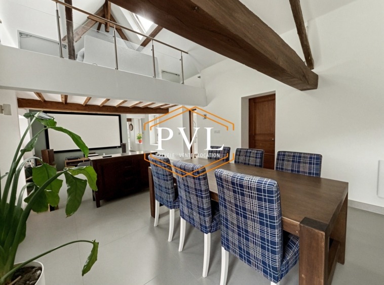Dès l’entrée, vous serez conquis par le cachet de l’ancien : poutres apparentes, cheminée et belle luminosité dans la pièce de vie.