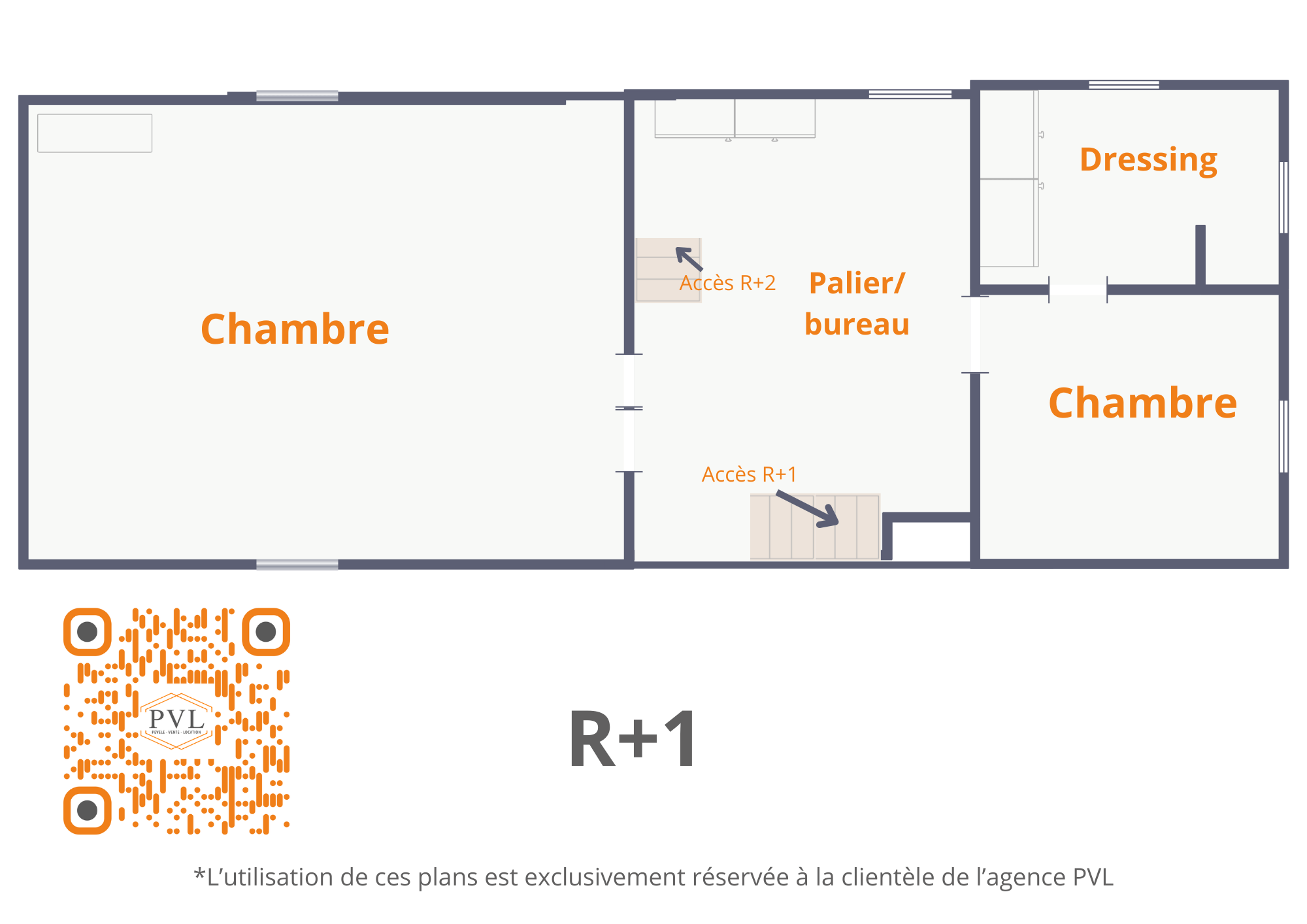 À l’étage, l’espace nuit se compose de deux chambres de 16 m² et d’un bureau avec rangements, idéal pour le télétravail.