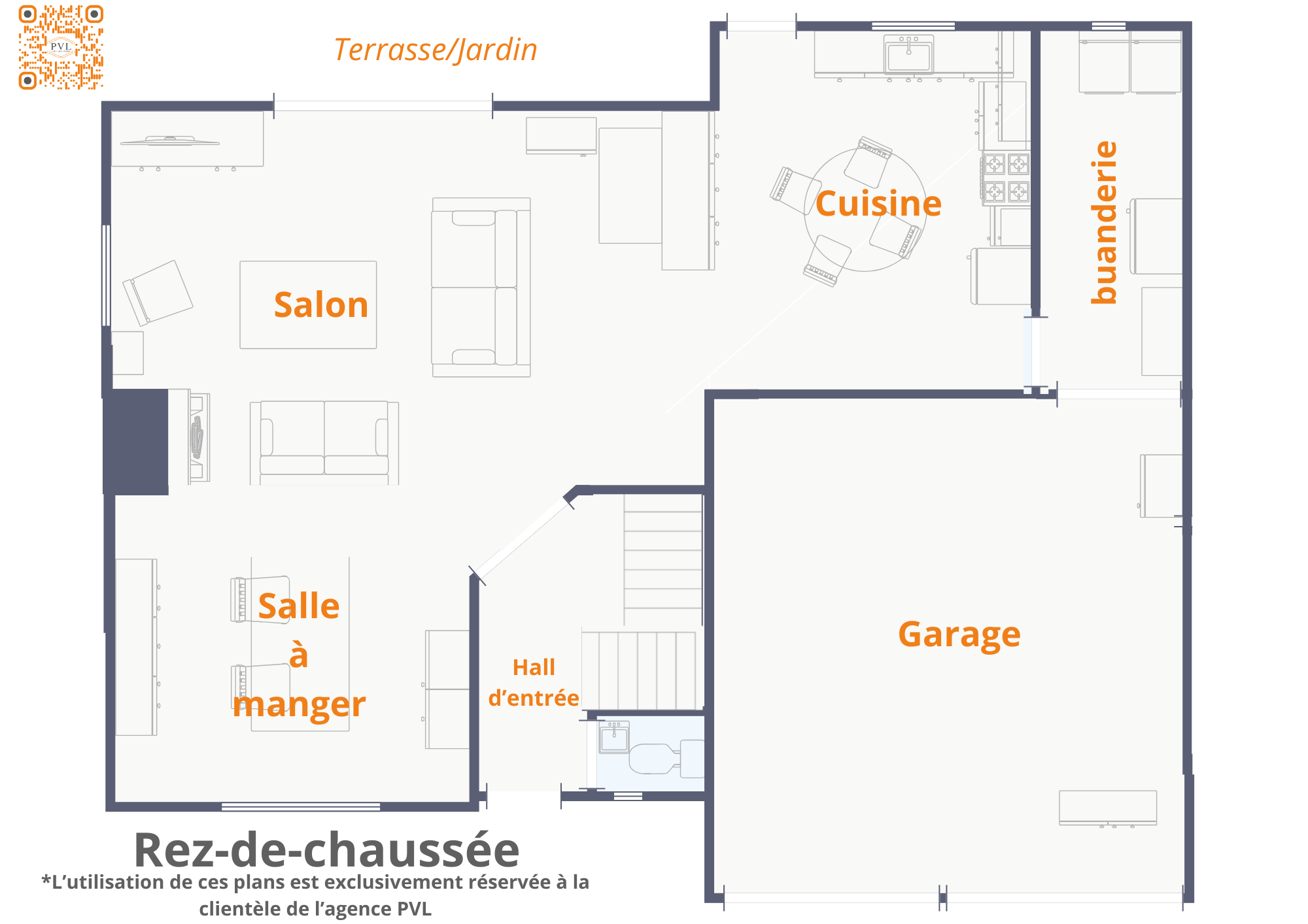 Elle se compose au rez-de-chaussée d’une grande pièce de vie lumineuse avec cheminée, d’une cuisine ouverte équipée, d’une buanderie et d’un double garage.