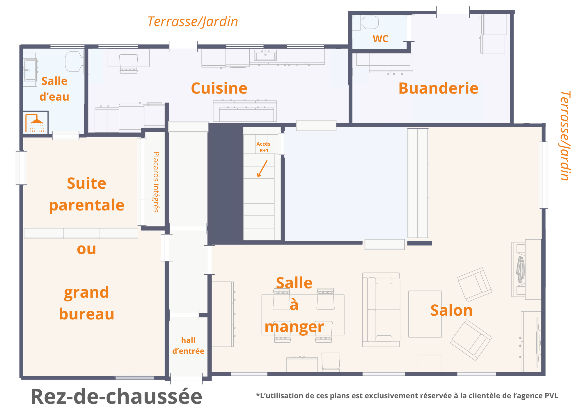 Une suite parentale, avec accès jardin, salle d’eau et WC, complète le rez-de-chaussée.