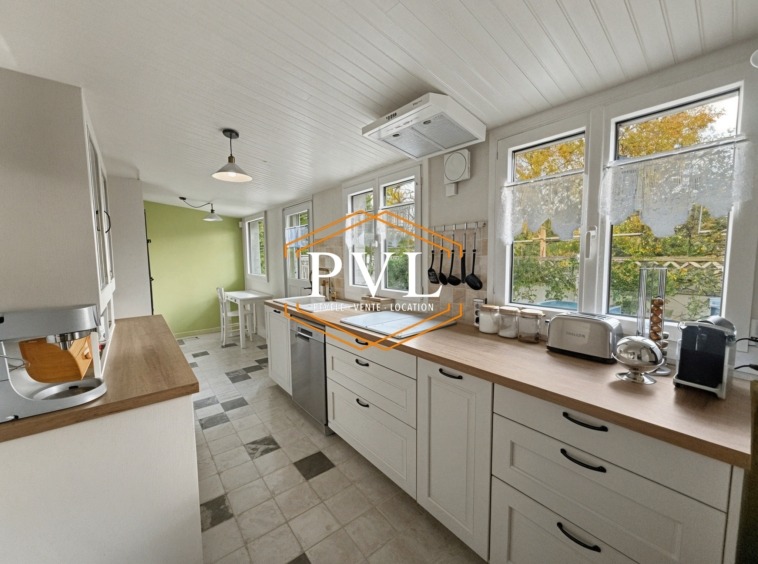 La cuisine équipée offrant une vue et un accès au jardin mène aussi à une grande buanderie.
