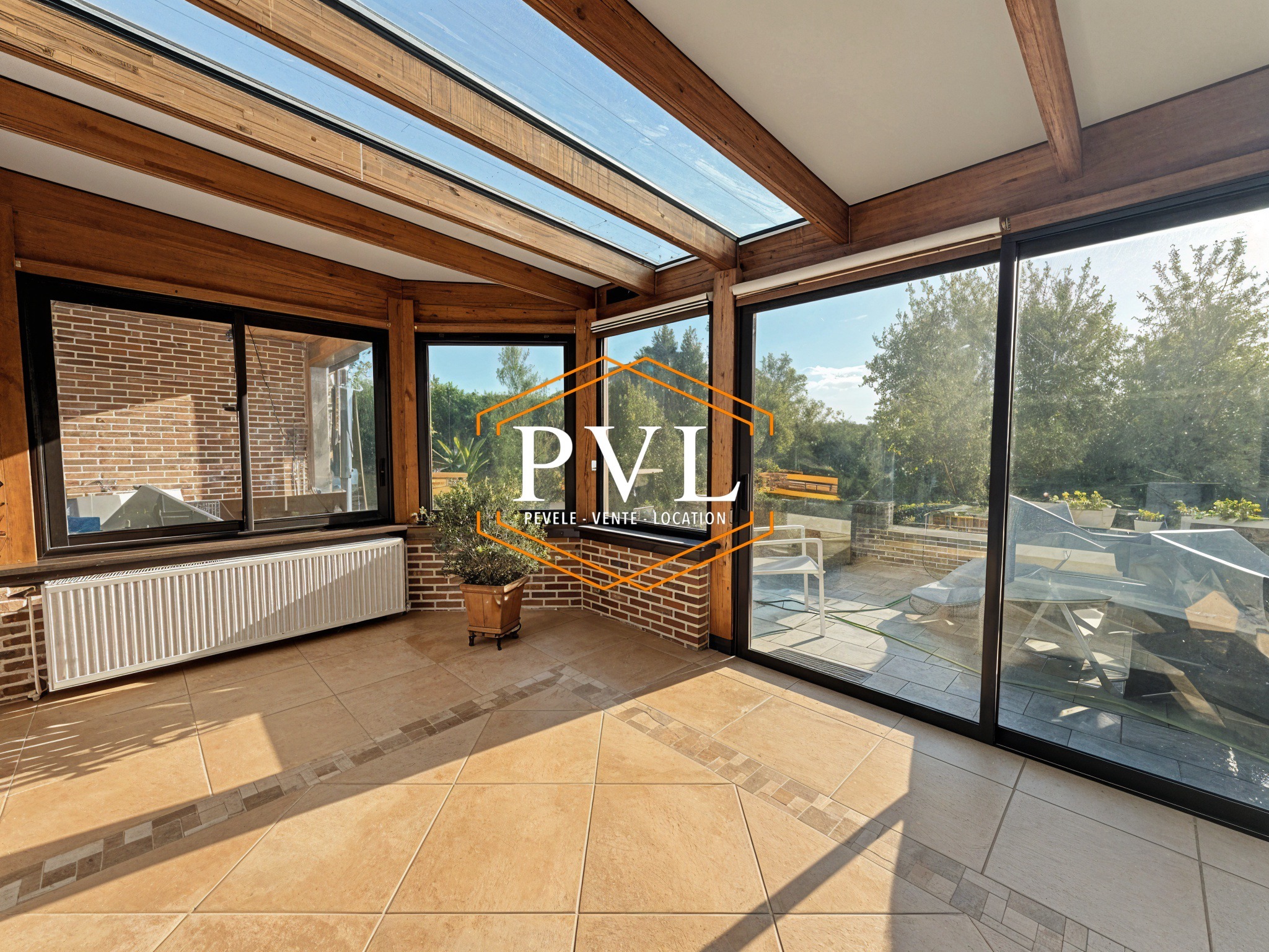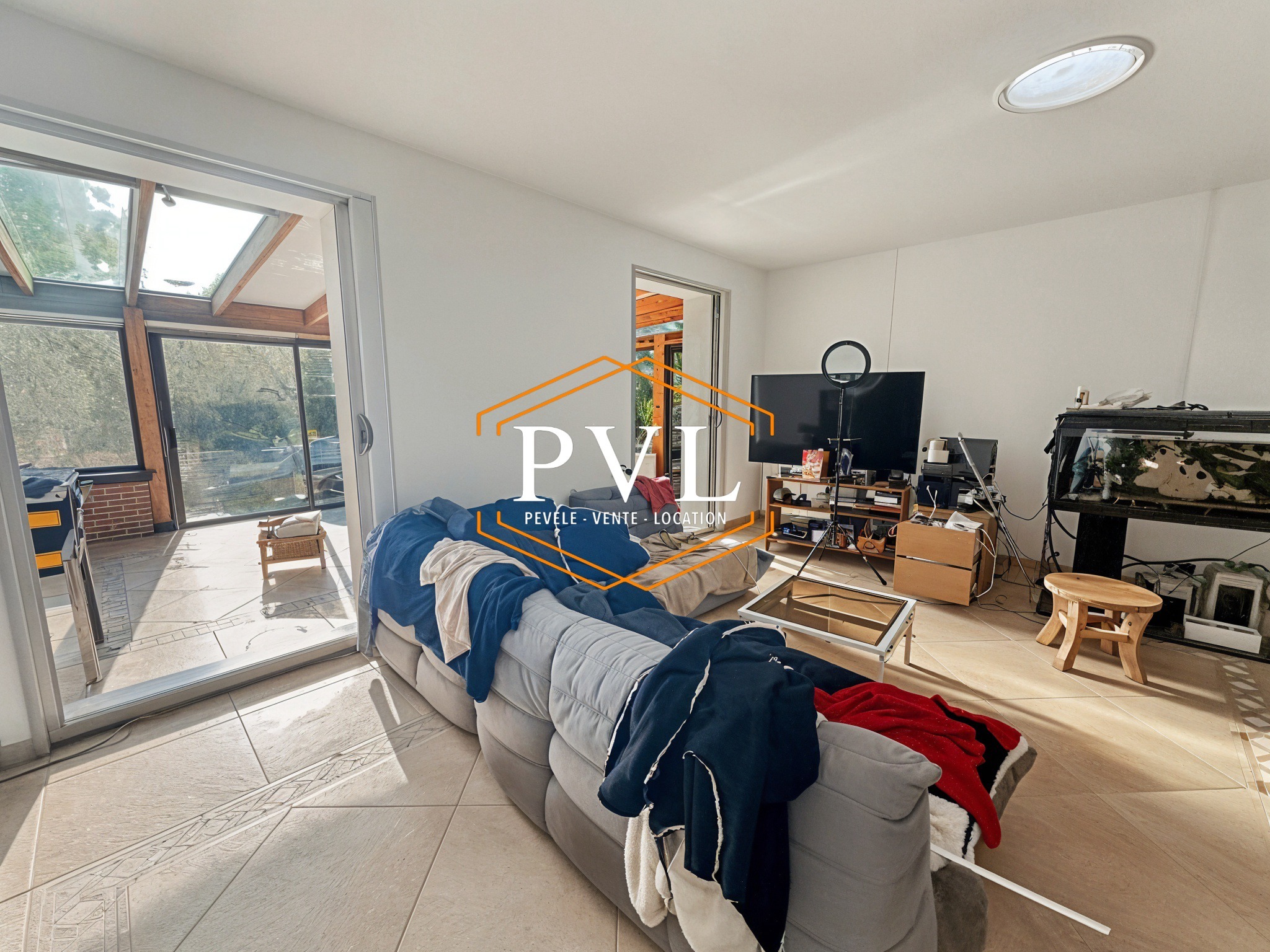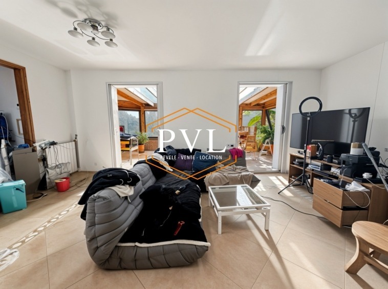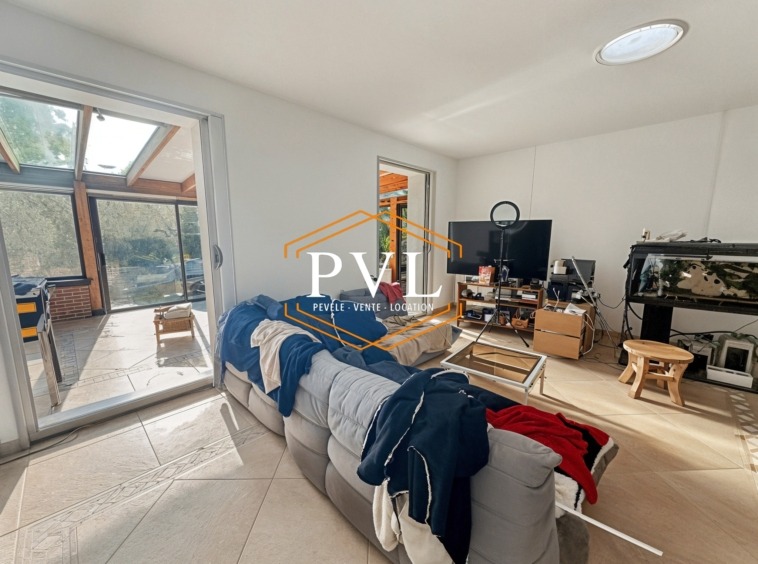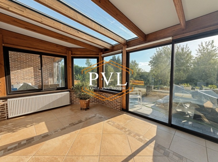 Le hall d’entrée dessert le séjour tourné vers le jardin, avec cuisine équipée ouverte ainsi qu’une grande véranda chauffée.